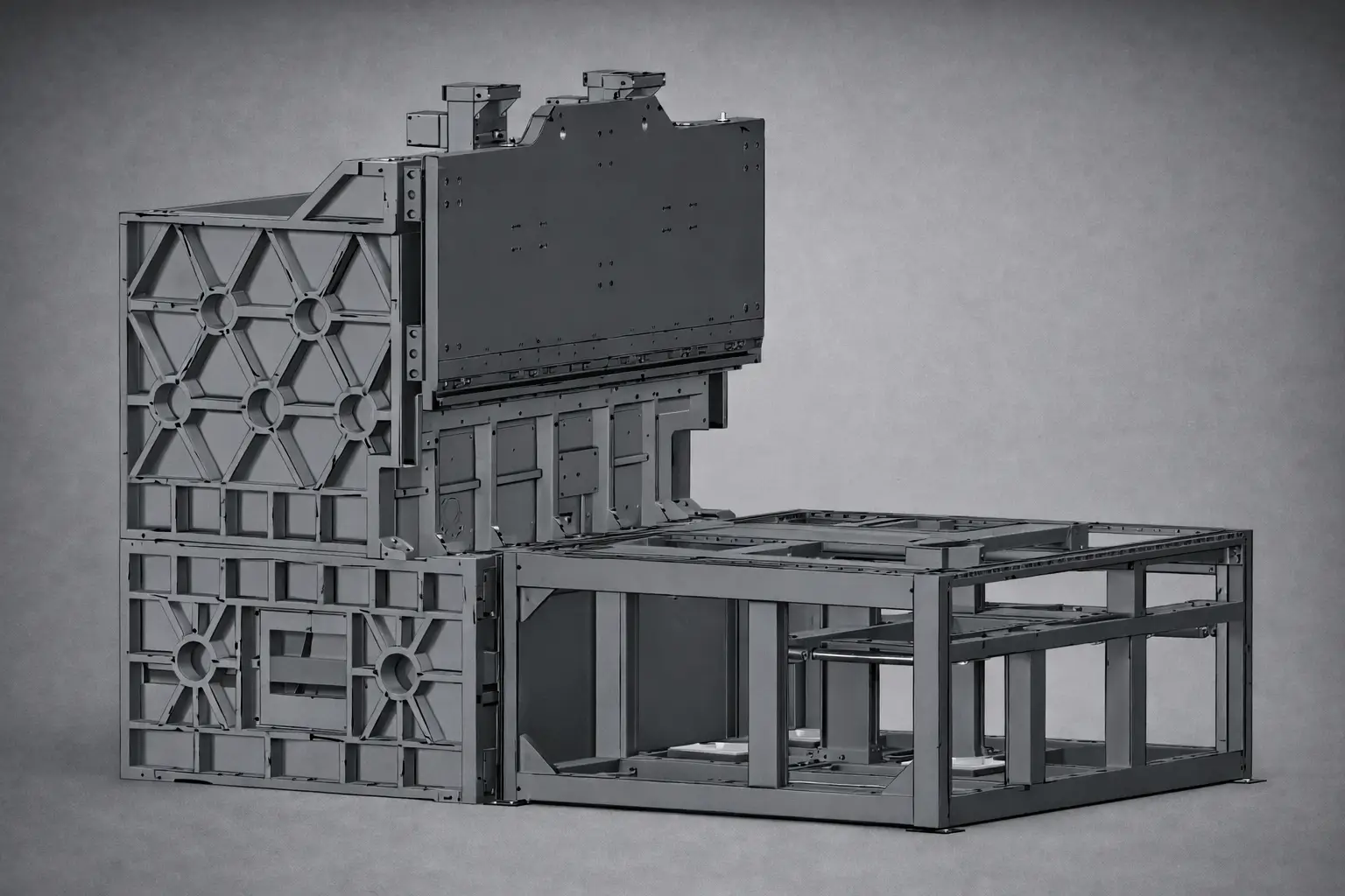 A estrutura central é fabricada com ligas de fundição de alta qualidade (QT500-7 e HT300), submetida a análises por elementos finitos, garantindo rigidez, estabilidade e durabilidade industrial.